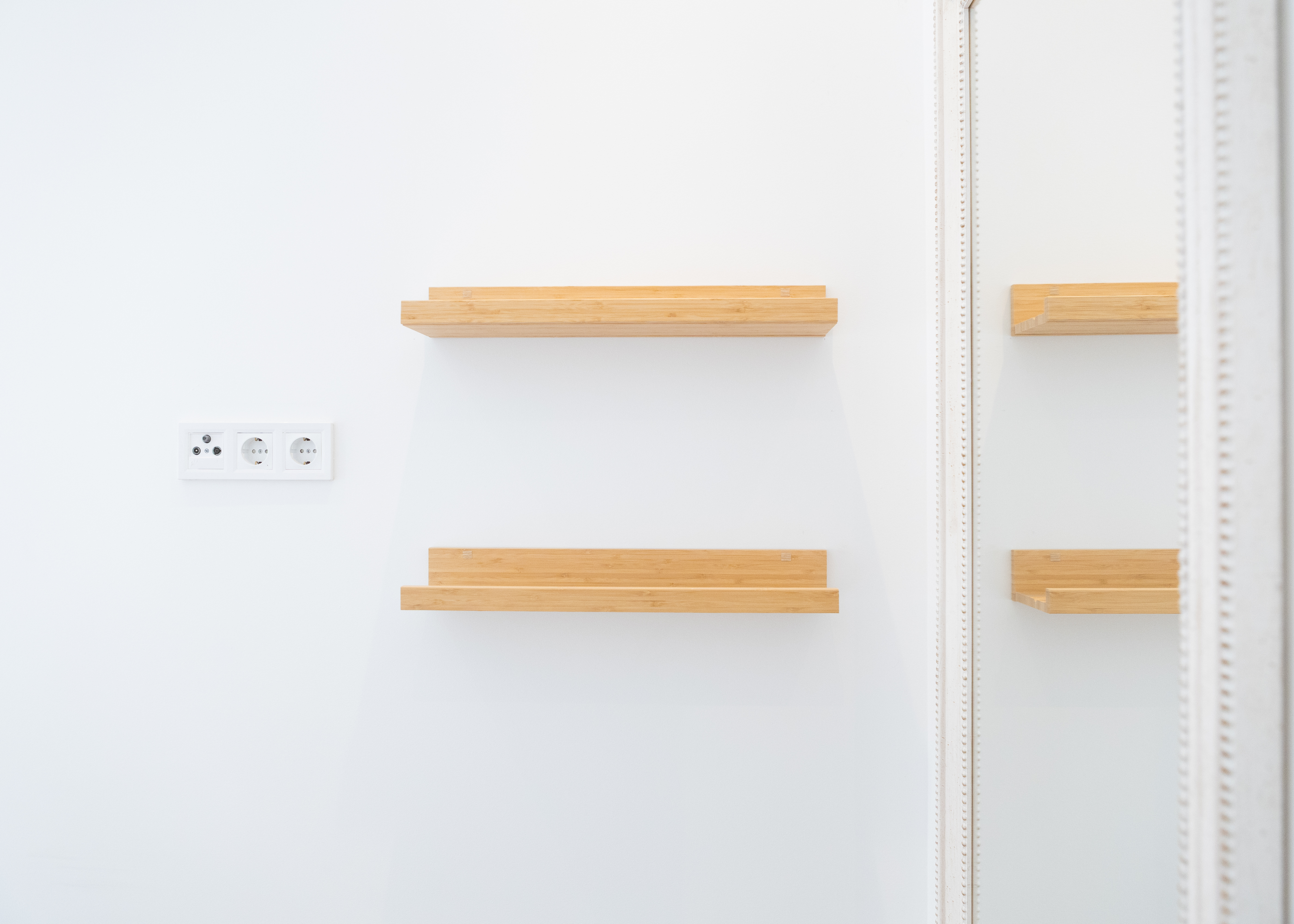 Decoración minimalista con estantes de madera. Reformas Mazur diseña interiores modernos con acabados perfectos y materiales de alta calidad.